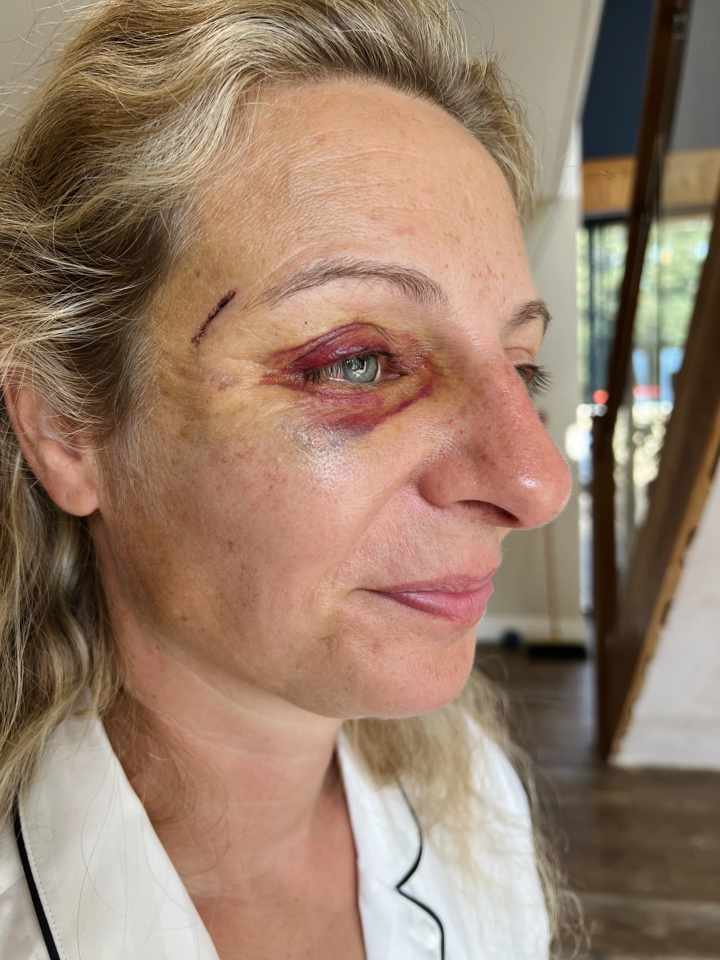 Helen’s black eye was showing in a mixture of different bruise colours, some green-yellow, some purple and some black. I had to use around 12 different skin tones from my corrective palette to conceal it. Once the black eye was covered, the eyeshadow on each eye presented differently due to the undertones of the makeup so I had to use different eyeshadow colours on each eye to make the whole look balanced.